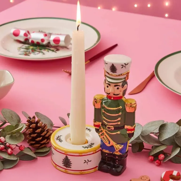 Skap en nostalgisk julestemning med Spodes Christmas Tree Nutcracker-lysestake. Denne 18 cm høye lysestaken er inspirert av vintage leker og prydes av en detaljrik grønn leksoldatfigur på en trommeformet base. Basen er dekorert med det klassiske Christmas Tree-mønsteret, som er en elsket del av Spodes julekolleksjon og gir en varm og festlig følelse.