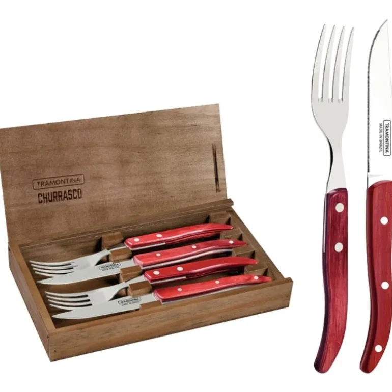 Tramontina Churrasco bestikksett inneholder to biffkniver og to bordgafler, levert i en elegant trekasse. Hver del er laget med blader i rustfritt stål og håndtak i behandlet polywood, festet med nagler i aluminium. Materialene er slitesterke og motstandsdyktige mot støt og høye temperaturer, noe som gjør settet ideelt til grillmåltider.
