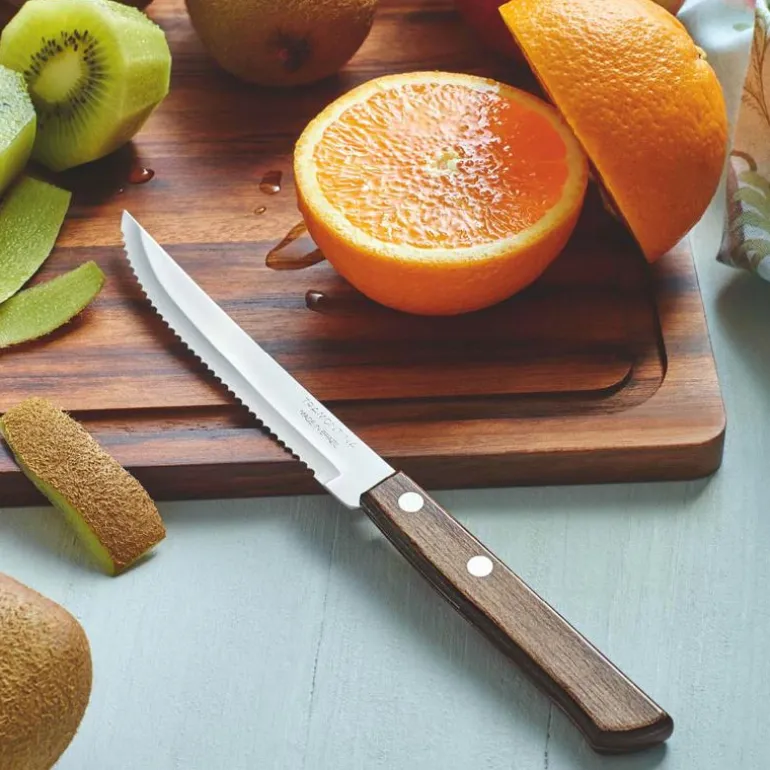 Bladet er laget i rustfritt stål og har en skarp takkete egg som gjør det enkelt å skjære gjennom et stykke med grillet kjøtt. Men knivene passer også ypperlig til å skjære opp frukt og annet godt. Knivene er like robuste som effektive og kombinasjonen av rustfritt stål med det behandlede trehåndtaket blir de til en fin detalj ved borddekkingen. Det flotte treet ligger bra i hånden, tåler godt varme og kan vaskes i maskin. Kan med fordel kombineres med Tramontinas øvrige sortiment av flotte bestikk.