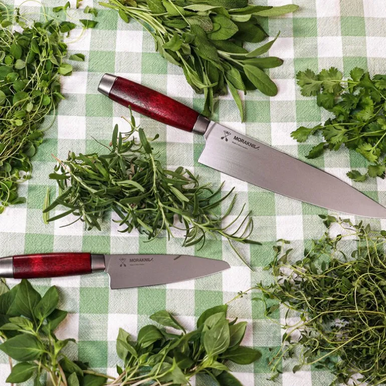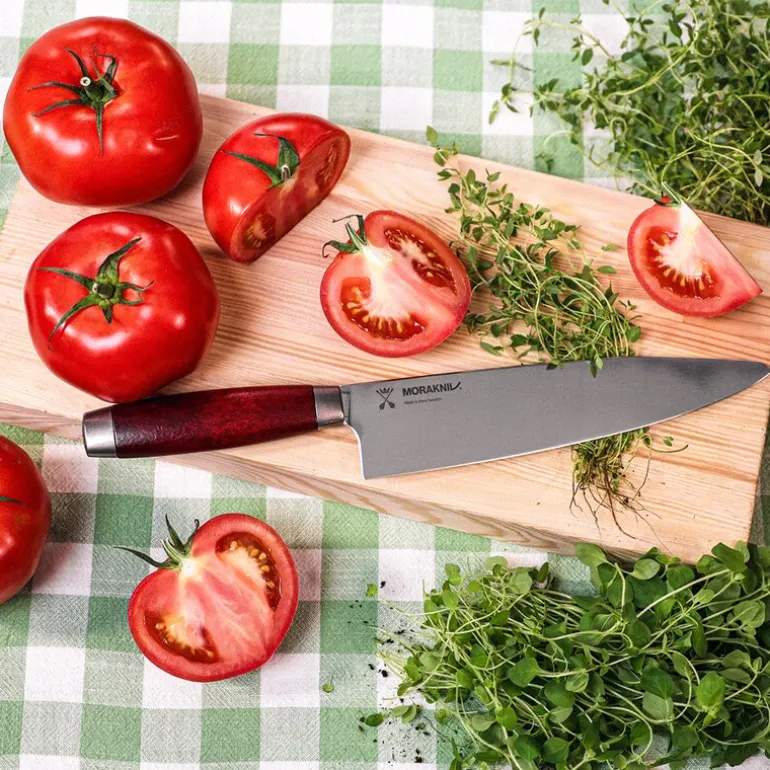Classic 1891 kokkekniv fra Morakniv er et mesterlig verktøy designet for å bli en forlengelse av hånden din, slik at du kan konsentrere deg fullt ut om matlagingen. Denne kniven er en del av Classic 1891-serien, som er utviklet for å imøtekomme alle typer behov på kjøkkenet, enten du hakker grønnsaker, skjærer kjøtt eller tilbereder delikate retter. Håndtaket, laget av vakkert rødt bjørketre, gir en ergonomisk og behagelig følelse, mens det svenske rustfrie stålet sørger for at bladet holder seg sylskarpt og pålitelig gjennom enhver oppgave. Med et knivblad på 22 cm og en tykkelse på 2,3 mm, gir denne kokkekniven deg full kontroll over arbeidet ditt.