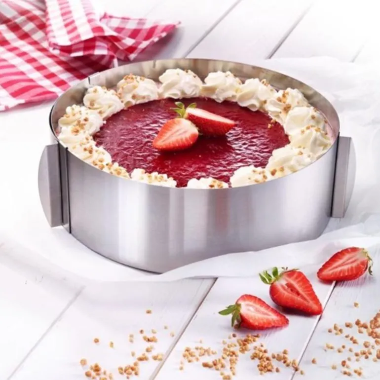Med denne ekstra høye og justerbare kakeringen kan du enkelt velge både høyde og form på kaken. Du kan bruke kakeringen med bakepapir når du baker kakebaser eller myke kaker, når du lager iskrem eller desserter.Diameteren kan justeres fra 16cm til 30cm og høyden er hele 8,5cm. Praktisk håndtak hjelper deg å justere ringen til rett størrelse.Tåler oppvaskmaskin.5 års garanti.