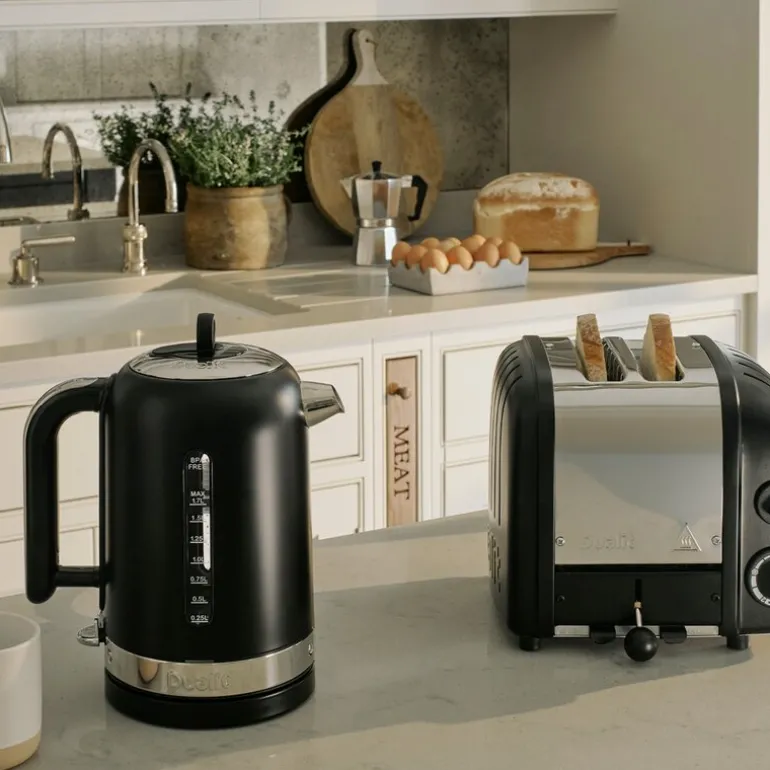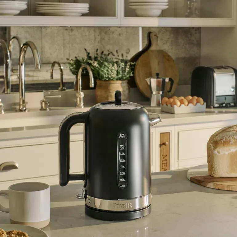 Den klassiske vannkokeren fra Dualit, med et volum på 1,7 liter, har en tidløs matt svart finish og detaljer i rustfritt stål. Håndtaket har et silikonbelegg som sikrer et komfortabelt og sikkert grep, mens tutens dryppfrie design gjør bruk enkel og ryddig. Denne stillegående og raske vannkokeren, med en effekt på 3000 W, er både funksjonell og estetisk tiltalende – et perfekt tilskudd til ethvert kjøkken.