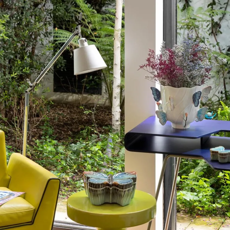 Kolleksjonen er et samarbeid mellom supermodellen Claudia Schiffer og Bordallo Pinheiro, som sammen har utviklet en samling av verk preget av varemerkets realistiske stil og Claudia Schiffers kjærlighet til landlige miljøer. Akkurat denne vasen er inspirert av det tyske området Rhens sommerfugler og gjennom dette kunstneriske verket ønsker Schiffer å hylle sitt opphav. Bordallo Pinheiro ble etablert i Portugal og startet sin keramiske produksjon 1884. Gründeren Raphael Bordallo Pinheiro viste gjennom keramikken en kunstnerisk og humoristisk stil. Inspirasjonen til sine produkter fant han i dagliglivet i Portugal. Han vant flere internasjonale priser og var kjent langt utover de Portugisiske landegrenser for sine kunstneriske evner, men også for sin interesse og utvikling av teknisk produksjon, spesielt innen den naturtro formgivingen og ikke minst den fargerike og fine glaseringen. Dette ser vi også i dagens produkter med et unik uttrykk av form og glasur som gjengir naturen på en nøyaktig og humoristisk måte.