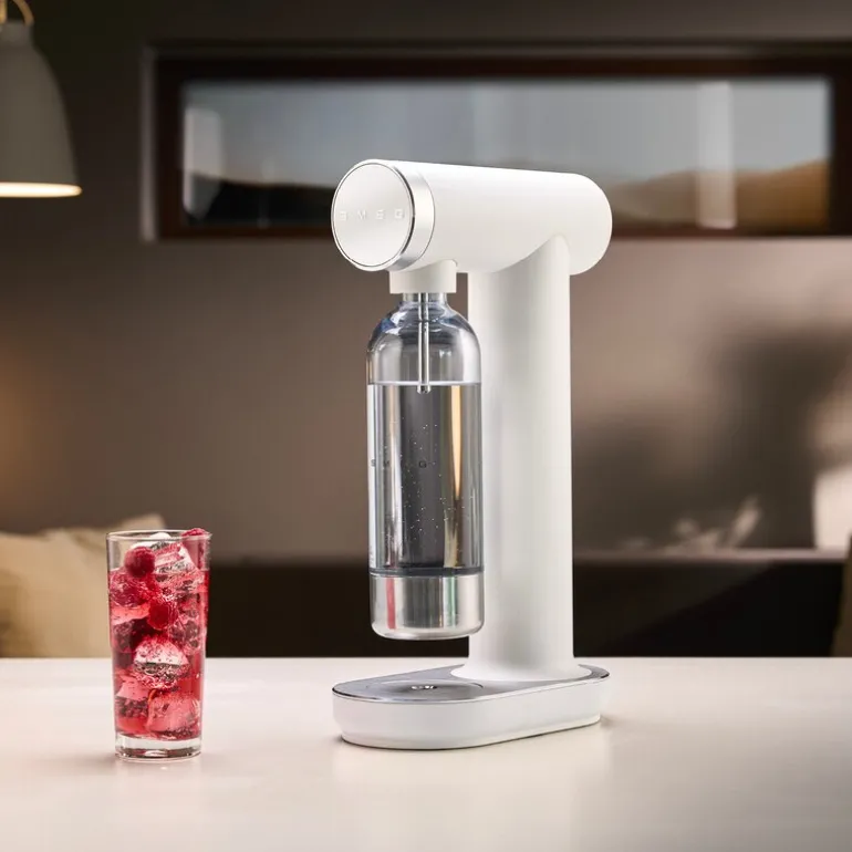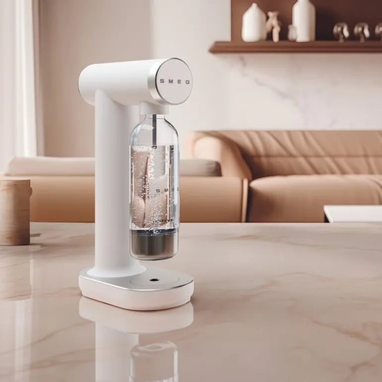 Collezione SKC01 hvit kullsyremaskin fra Smeg gir deg muligheten til å lage kullsyreholdige drikker hjemme, akkurat slik du ønsker det. Den smarte dreieknappen lar deg enkelt justere kullsyrenivået etter smak – fra lett perlende til kraftig sprudlende. Maskinen fungerer med de fleste skrubare CO₂-sylindere (400–425 g / 60 l) og krever ingen installasjon. Det gjør det enkelt å komme i gang – fyll flasken, tilsett kullsyre og nyt en frisk og boblende drikke på sekunder.