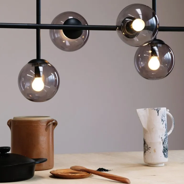 Med sin lengde på 93 cm er Como pendel spesielt designet for langbord, spiseplasser eller større rom der den fungerer som et funksjonelt og dekorativt element. Lampen bruker E14-sokkel, og du kan velge pærer som gir den lysstyrken og fargetemperaturen som passer best til dine behov. De røykfargede glassene gjør det mulig å bruke kraftige lyspærer uten at lyset blir blendende. Lampen kan også kombineres med dimbare pærer, slik at du kan justere belysningen etter stemningen, enten det er til koselige middager, lekser eller rengjøring.