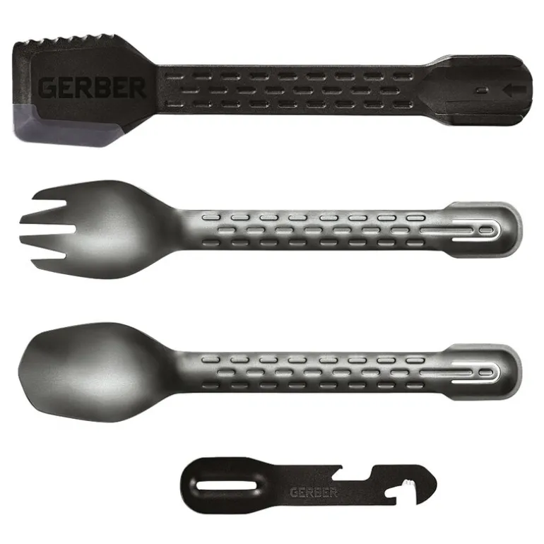 ComplEAT Cook Eat Clean bestikksett onyx fra Gerber. Sett med multifunksjonelt bestikk, en praktisk følgesvenn på campingtur, overlevelsesutflukt og andre utendørsaktiviteter. Skje, gaffel og omrører/øse med silikonbelegg og delvis tannet kant.
