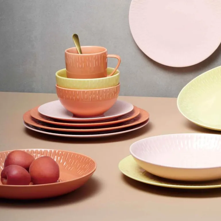 Serviset er laget av porselen som er brent ved over 1300 grader, og fargen er blandet inn i glasuren. Effekten av det er at porselenets fine hvite farge bryter gjennom relieffet, og skaper et lett, lekent og delikat uttrykk.