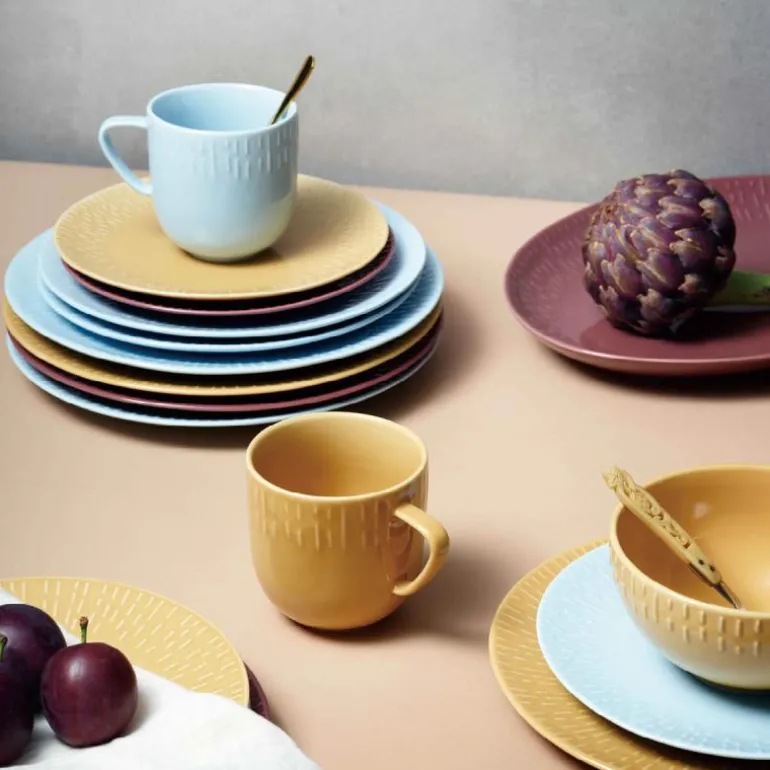 Serviset er laget av porselen som er brent ved over 1300 grader, og fargen er blandet inn i glasuren. Effekten av det er at porselenets fine hvite farge bryter gjennom relieffet, og skaper et lett, lekent og delikat uttrykk.