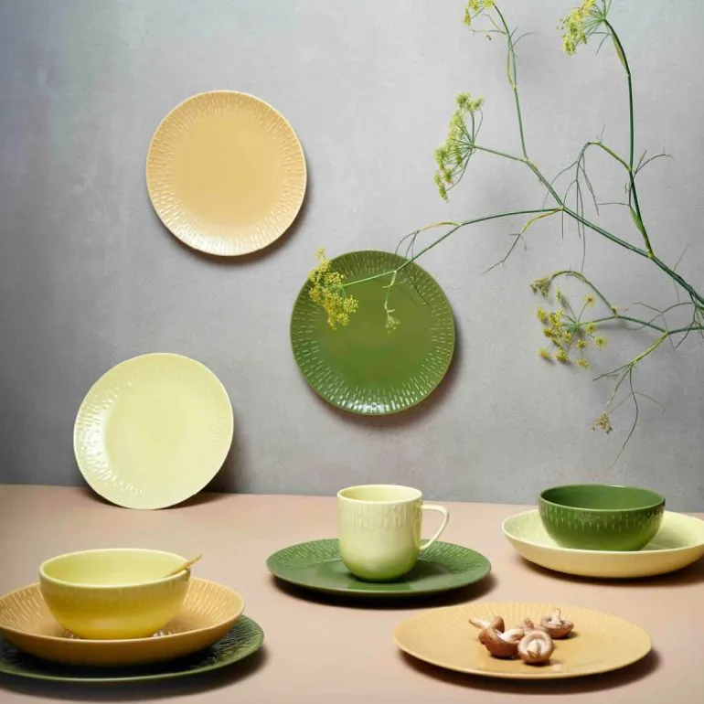 Serviset er laget av porselen som er brent ved over 1300 grader, og fargen er blandet inn i glasuren. Effekten av det er at porselenets fine hvite farge bryter gjennom relieffet, og skaper et lett, lekent og delikat uttrykk.