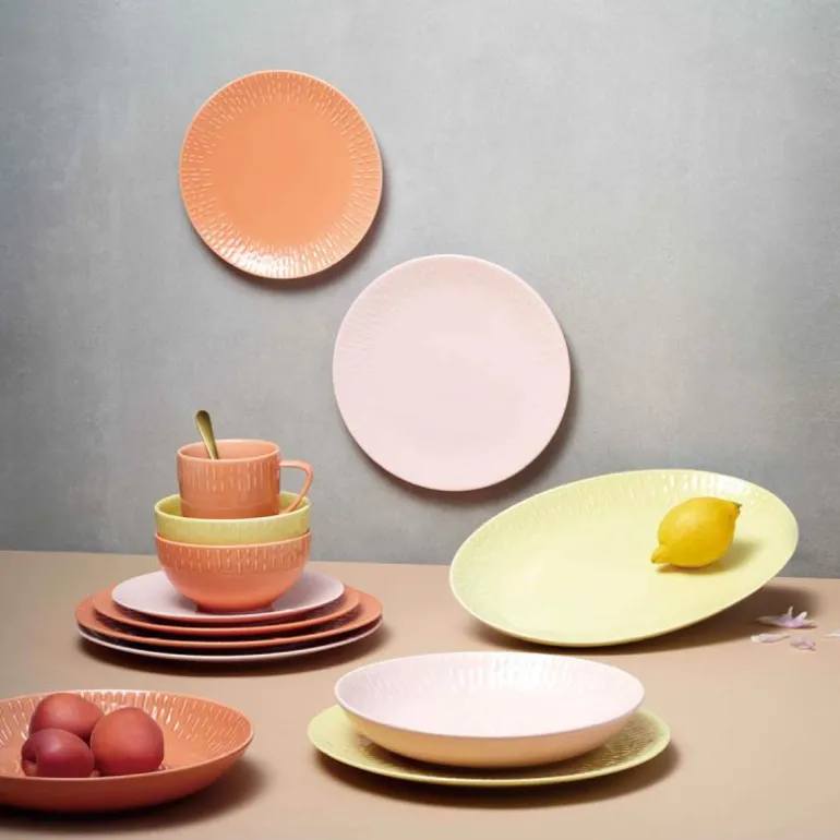 Serviset er laget av porselen som er brent ved over 1300 grader, og fargen er blandet inn i glasuren. Effekten av det er at porselenets fine hvite farge bryter gjennom relieffet, og skaper et lett, lekent og delikat uttrykk.