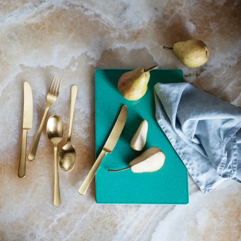Settet er utstyrt med et slitesterkt PVD-belegg som beskytter mot riper og sikrer at den vakre gullfargen bevares over tid. Selv om bestikket tåler oppvaskmaskin, anbefales håndvask for å bevare den luksuriøse finishen og sikre langvarig holdbarhet.