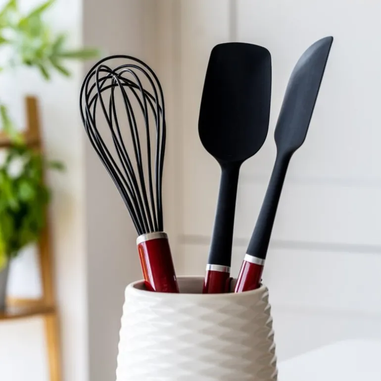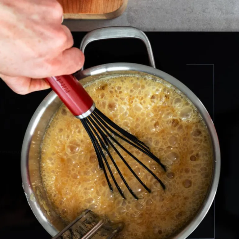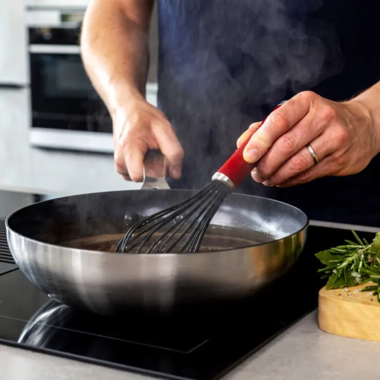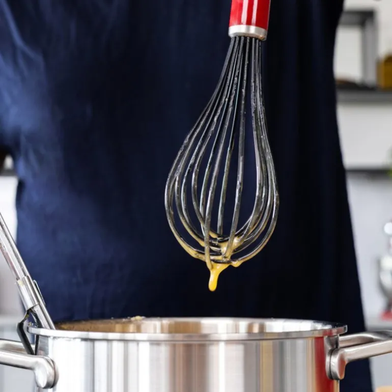 Core ballongvisp 27,5 cm i fargen empire red fra kitchenAid med silikonbelagte tråder er ideell for pisking av marengs, egg og sauser uten klumper. De solide trådene i rustfritt stål er belagt med silikon, som tåler temperaturer opptil 232°C, og kan trygt brukes på non-stick-overflater. Det ergonomiske, velbalanserte håndtaket gir komfortabel bruk, og vispen tåler oppvaskmaskin for enkel rengjøring.