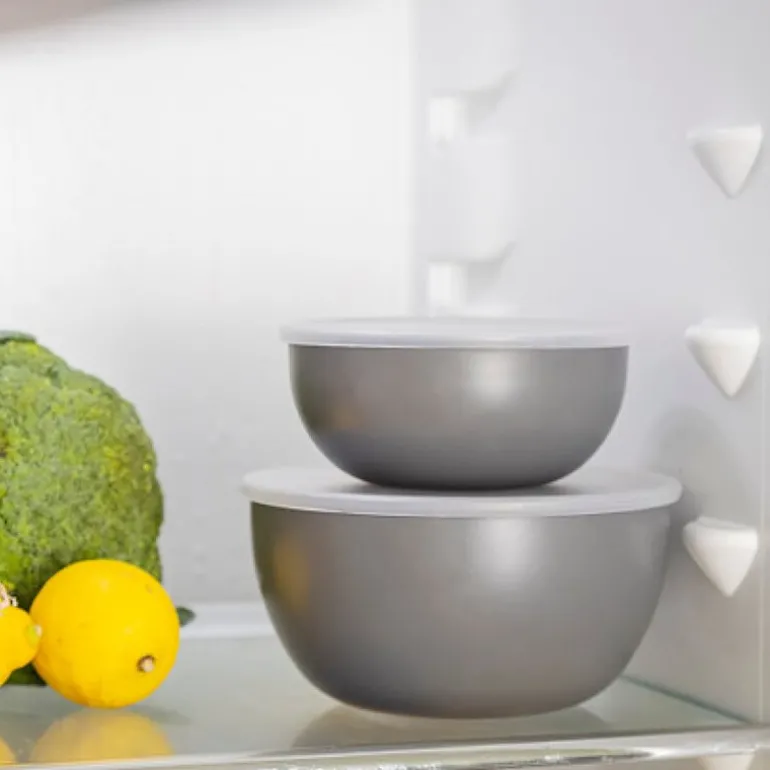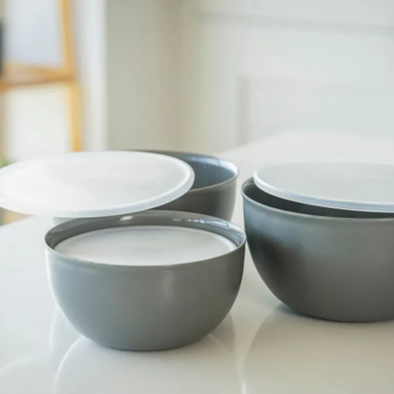 KitchenAid Core bollesett i Charcoal Grey inneholder fire måleskåler med lokk i størrelsene 1½, 2½, 3½ og 4½ kopper, tilsvarende 355 ml, 591 ml, 828 ml og 1065 ml. Settet er designet for å gjøre det enklere å måle opp, forberede og oppbevare både tørre og våte ingredienser. Lokket holder innholdet friskt, og gir deg mulighet til å forberede råvarer i god tid før bruk.