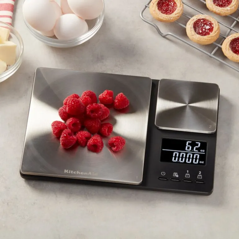 KitchenAid Core Dual Digital Kjøkkenvekt er en avansert og svært presis matvekt som sikrer nøyaktighet for alle typer ingredienser. Med sitt innovative dobbeltplattformdesign, gir denne vekten fleksibilitet for både store og små målinger. Den større plattformen kan veie opptil 5000 gram med intervaller på 1 gram, ideelt for å måle hovedingredienser i større mengder, mens den mindre plattformen kan veie inntil 500 gram med en utrolig presisjon på 0,01 gram, perfekt for mindre mengder som gjær og krydder, noe som er essensielt for presis baking og matlaging fra bunnen av.