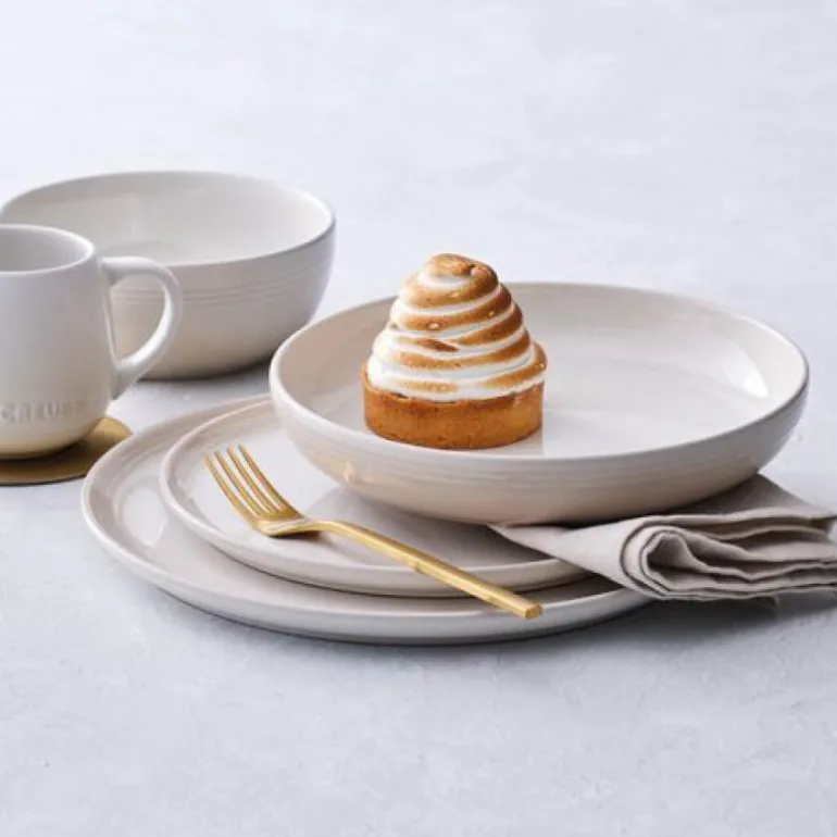Coupe Collection middagstallerken fra Le Creuset på 27 cm i fargen meringue. Piff opp hverdagens spisebord med disse fine tallerkenene, som med sin vakre glasur gjør det lekende enkelt å dekke et elegant bord. Tallerkenene kan også uten problemer brukes til mer festlige anledninger, kanskje med en fin serviett og en matchende duk?