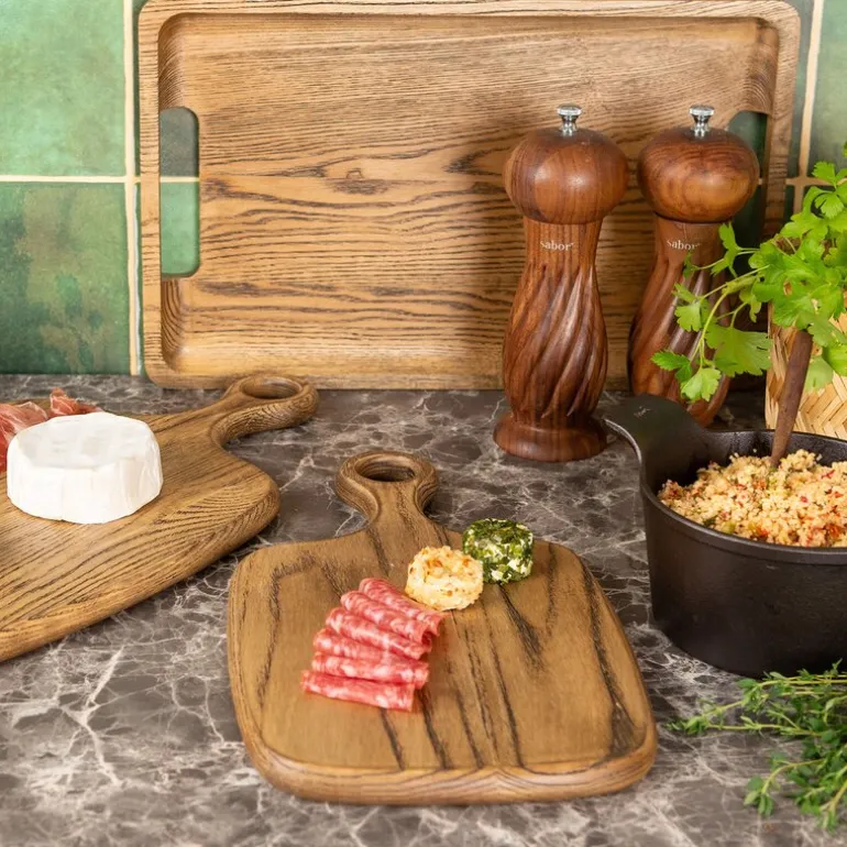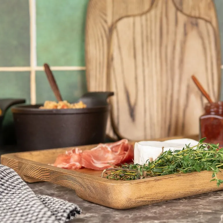 Crude serveringsbrett 37,5×25 cm natur har et naturlig, brunaktig og rustikt utseende, og er laget av robust asketre. Denne fjølen er perfekt for servering av tapas, snacks eller for å tilføre et dekorativt preg på kjøkkenbenken med krydder og oljer.
