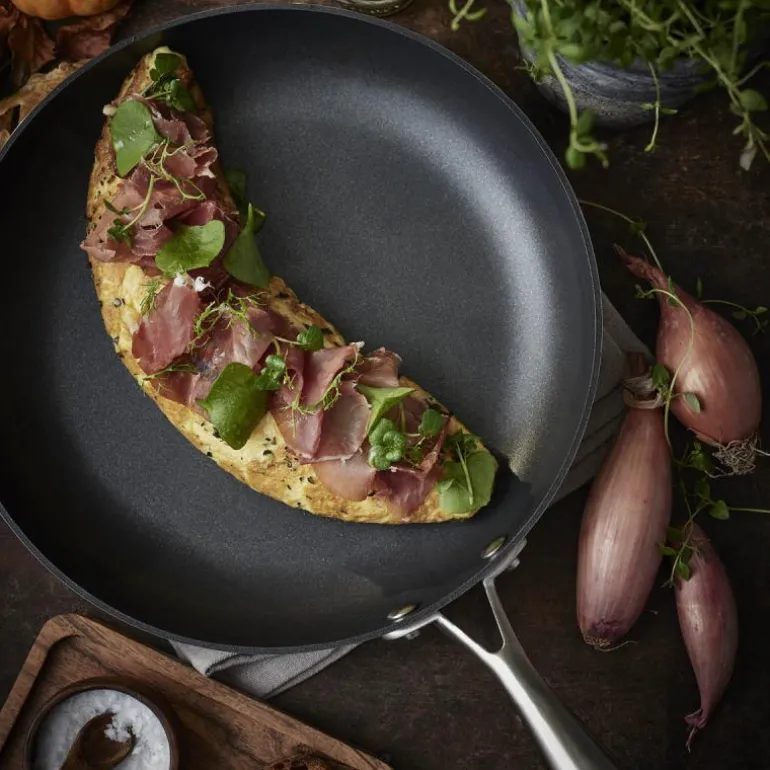 Stratanium gjør også at du slipper å bekymre deg for hvilke redskaper du bruker – det solide belegget tåler til og med metallredskaper. Stekepannen er kompatibel med alle typer komfyrer, også induksjon, i tillegg er den ildfast opp til 260°C.