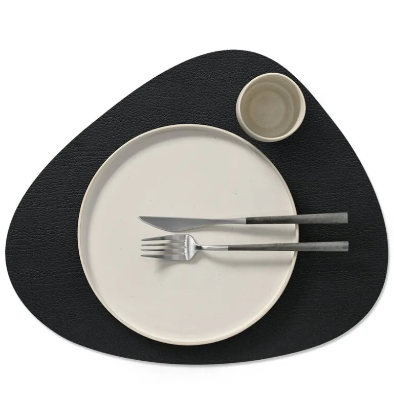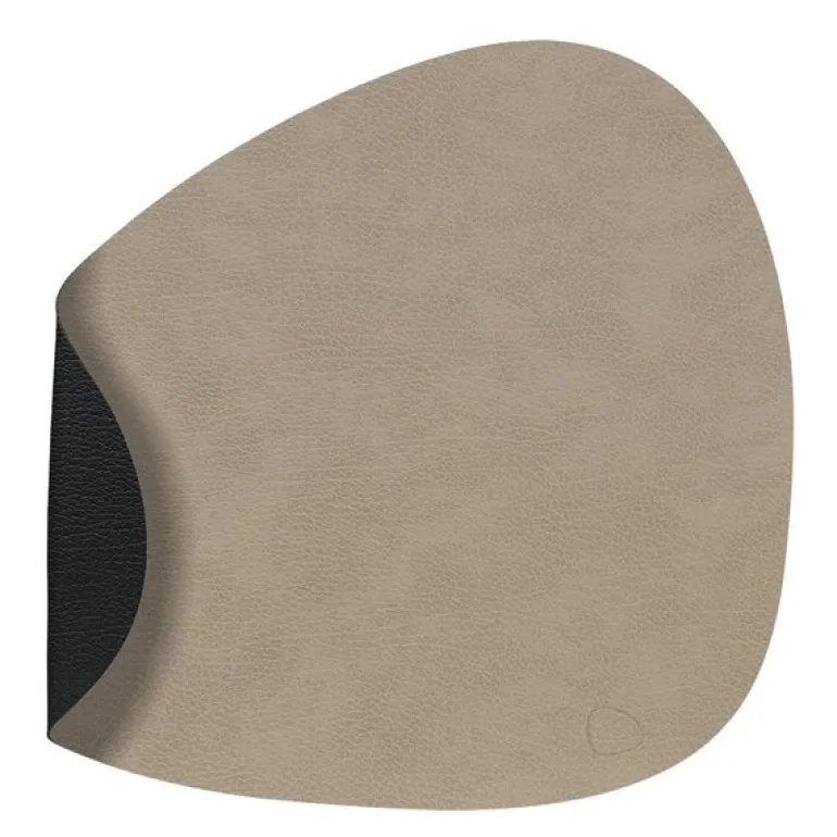 Curve Bull brikke tosidig varmgrå/svart. TABLE MAT DOUBLE CURVE er LIND DNAs mest allsidige spisebrikke – en tosidet spisebrikke laget av OEKO-TEX®-sertifisert resirkulert skinn med forskjellige farger og overflater på hver side.