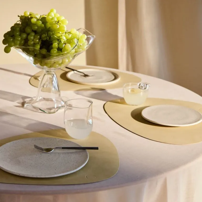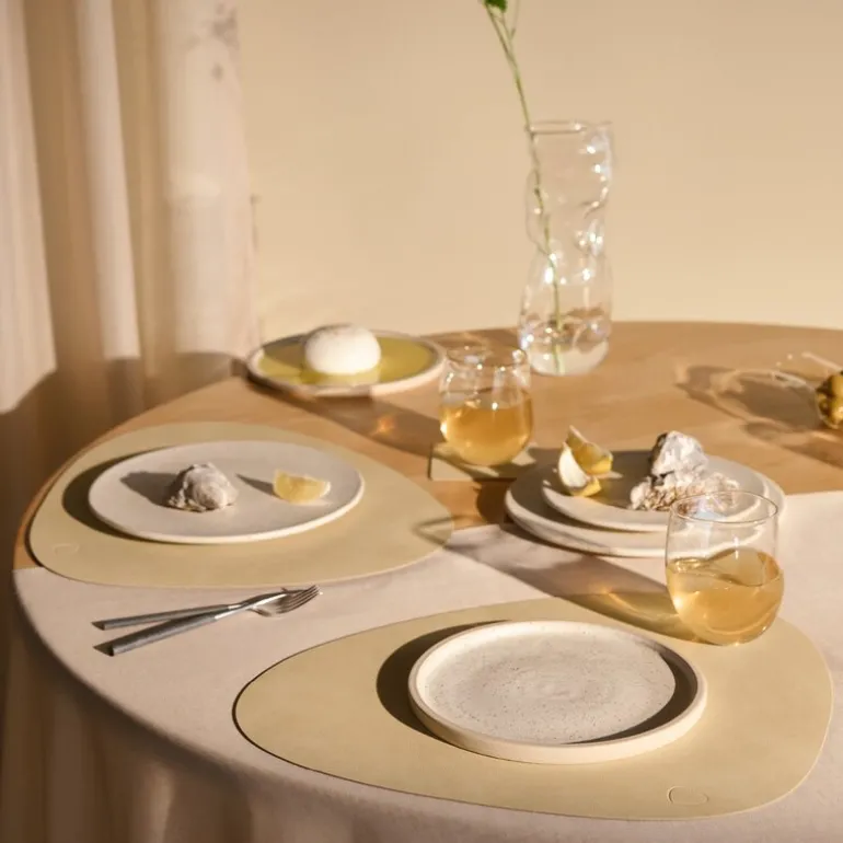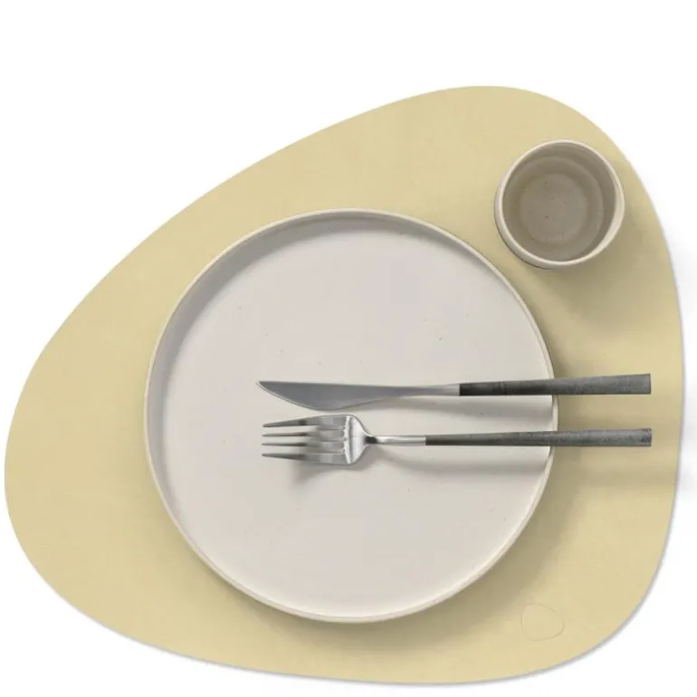 Curve Nupo spisebrikke L 37×44 cm lemon sorbet. TABLE MAT DOUBLE CURVE fra LIND DNA er en funksjonell og stilfull spisebrikke, designet for maksimal fleksibilitet. Denne tosidige spisebrikken er laget av OEKO-TEX®-sertifisert resirkulert skinn, og har ulike farger og overflater på hver side, noe som gjør det enkelt å endre utseendet på bordet ved å snu den.