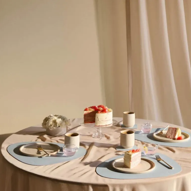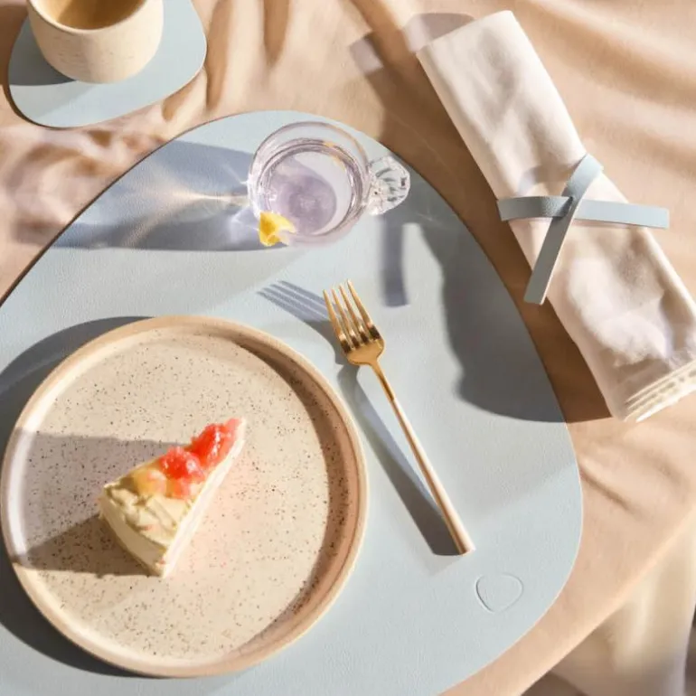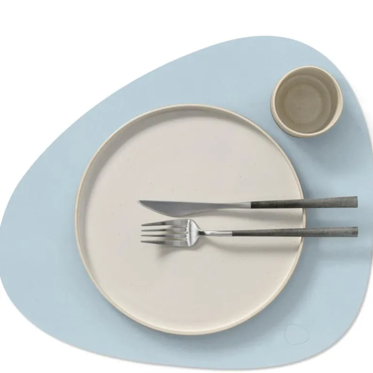 Curve Nupo spisebrikke L 37×44 cm soft sky. TABLE MAT DOUBLE CURVE fra LIND DNA er en funksjonell og stilfull spisebrikke, designet for maksimal fleksibilitet. Denne tosidige spisebrikken er laget av OEKO-TEX®-sertifisert resirkulert skinn, og har ulike farger og overflater på hver side, noe som gjør det enkelt å endre utseendet på bordet ved å snu den.