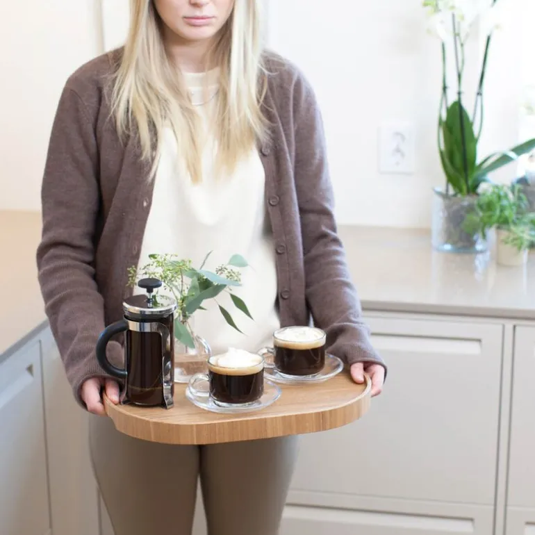 Non-slip overflaten sikrer at kopper og fat holder seg på plass, og den opphøyde kanten bidrar til stabilitet og forhindrer søl. Med gripevennlige håndtak integrert i designet er brettet enkelt å bære, noe som gjør det både praktisk og elegant i bruk.