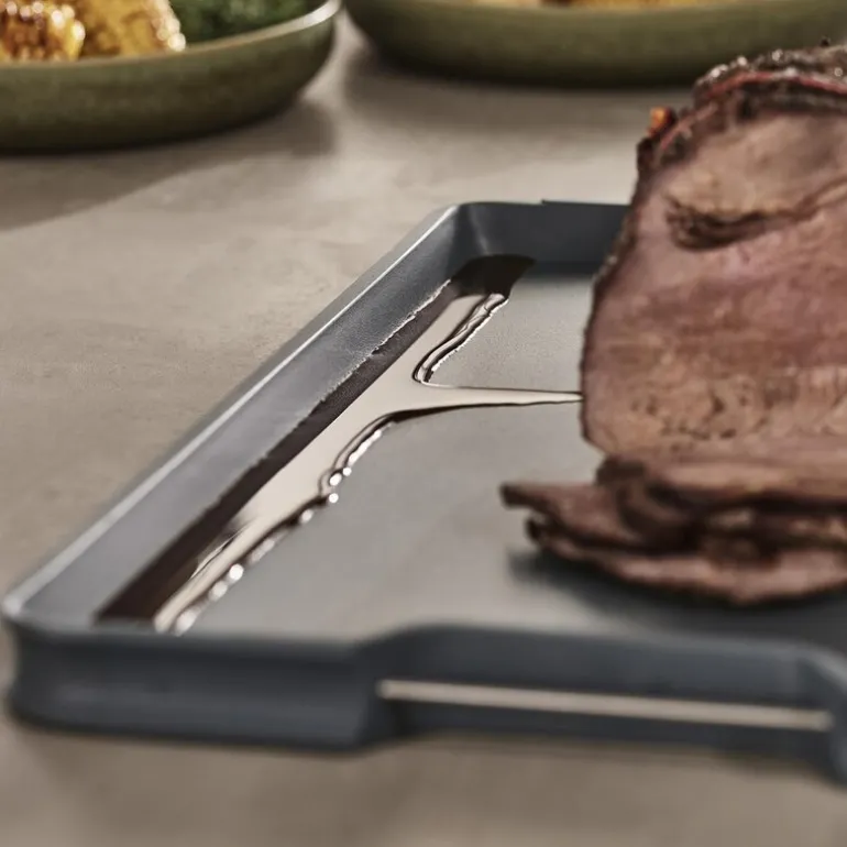 Cut&carve Plus sky skjærebrett 29×41 cm blå fra Joseph Joseph. Dette dobbeltsidige skjærebrettet med flere funksjoner er fullpakket med innovative funksjoner. Den har en unik vinklet base, hevede kanter og lett-helle hjørner, som alle hjelper til med oppsamling og avhending av smuler eller væsker ved skjæring eller utskjæring. På den ene siden av brettet er det et integrert kjøttgrep for ekstra hjelp ved skjæring, mens den andre siden gir en jevn skjæreflate for generell matlaging. Sklisikkere kanter sørger for at brettet holder seg på plass under bruk, og denne helt nye designen har nå håndtak i rustfritt stål på sidene for enklere løfting og bæring.
