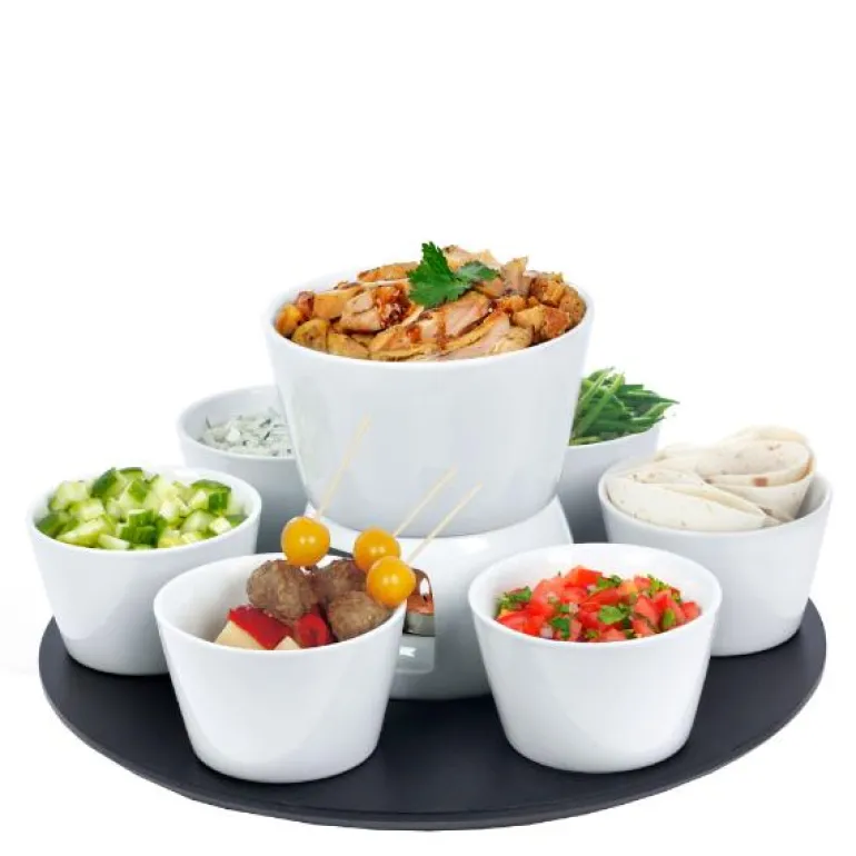 Tacosettet består av én stor og seks mindre skåler. Den store skålen står over et telys, som holder innholdet varmt. I ytterkant av fatet plasserer du de mindre skålene, som kan romme ulike grønnsaker, saus, rømme og guacamole – eller hva enn du liker å fylle tacoen din med. Alt er plassert på en roterende base, som gjør serveringen lekende lett. Alle delene er selvfølgelig laget av holdbart porselen som gjør at du kan servere taco hver dag, om du vil.