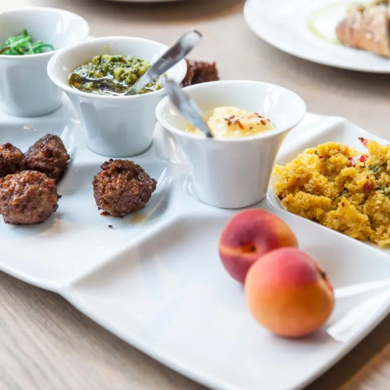 Porselensfat med 6 inndelinger og 3 små skåler. Fatet er ypperlig til tapas, ostebord, eller som påleggsfat.