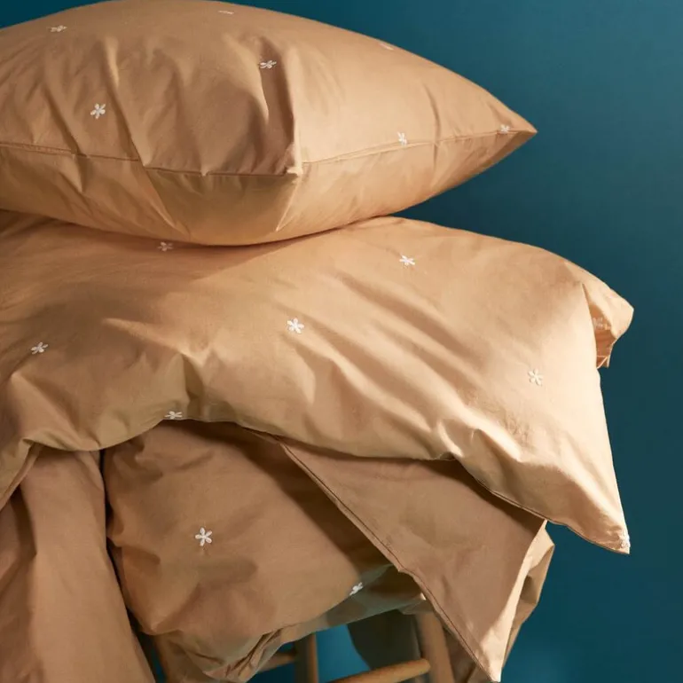Daisy sengetøy for ekstra lange dyner på 140×220 cm i sand og hvit fra Juna gir deg en nytolkning av det klassiske blomstermønsteret, der små, broderte blomster i hvitt skaper en vakker kontrast til den lune sandfargen. Designet balanserer det tidløse med en moderne estetikk, perfekt for å skape en varm og koselig atmosfære i hjemmet.