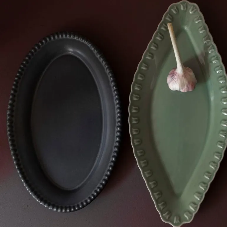 PotteryJo DARIA ovalt serveringsfat 35 cm ink black. Vakkert ovalt serveringsfat i relieffmønstret stengods. PotteryJo er laget med omhu i høykvalitets steintøy og keramikk – skapt, brent og håndlaget i Portugal, designet i Sverige. Den elegante og slitesterke DARIA-kolleksjonen er inspirert av plantenes livssyklus, spesielt spiringsprosessen og deres transformasjon. Denne kolleksjonen fremkaller en følelse av trygghet og håp om fornyelse, og representerer en organisk utforskning som har resultert i en kolleksjon av tidløse og elskede familiemedlemmer.