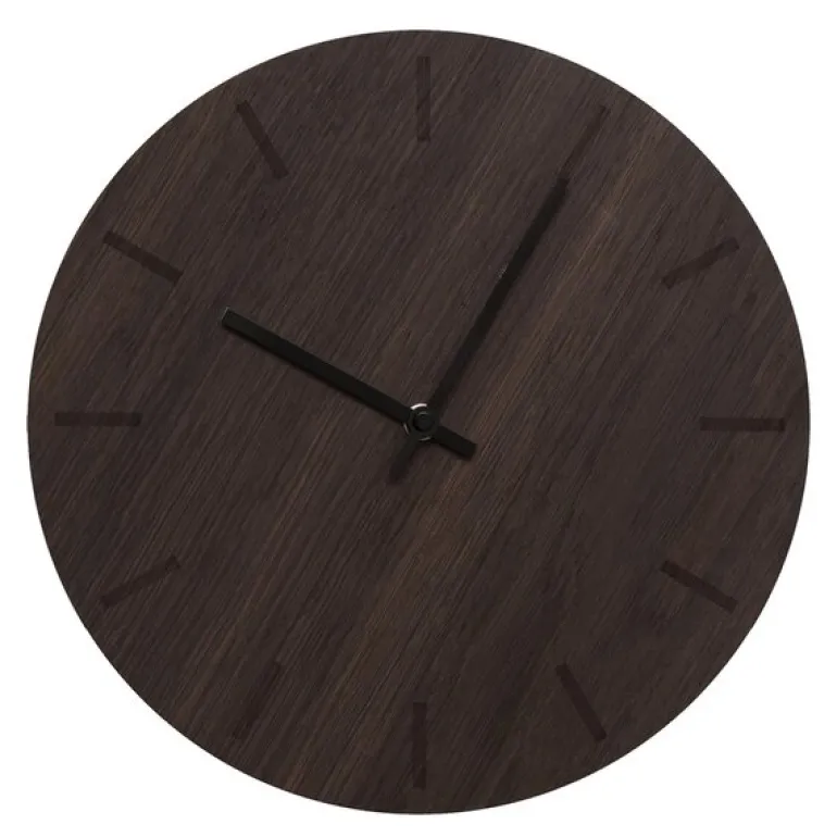 Denne vakre veggklokken fra Hemverk, laget av mørk eik, gir ethvert rom et elegant og naturlig innslag. Klokken måler 28 cm og har en rund, laserskåret urskive som fremhever treets årringer, noe som gir en unik karakter til hver eneste klokke. Med sitt mørke treverk og de stilrene svarte viserne smelter den perfekt inn i nordisk inspirerte interiører. Ønsker du at viserne skal skille seg ut eller harmonisere med treverket, kan du velge ønsket fargekombinasjon for å få den stilen som passer best i ditt hjem.