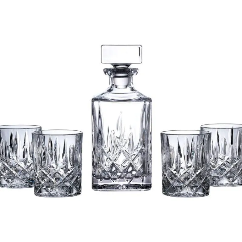 Decanters Decanter Sq Spirit 4 DOF 5PSet. Fra arvemønstre til slående moderne design, Royal Doulton-serien med karaffelsett i krystall omfavner allsidighet og varig stil for en rekke favorittbrennevin, inkludert whisky og mer. Slipp aromaen og smakene til din foretrukne drink med de matchende krystallglassene og server drinker med venner med stil. Sett med elegant, firkantet karaffel og 4 drinkglass (i eske).