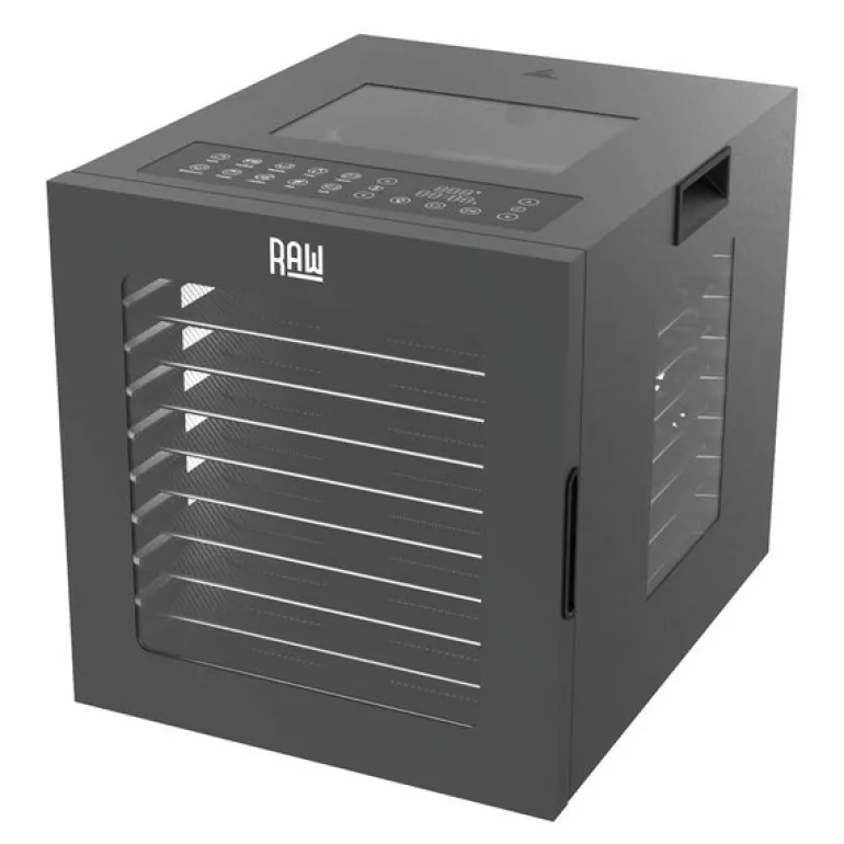 RAW DH10 med 10 hyller i svart er en romslig og brukervennlig dehydrator som gir deg muligheten til å tørke alt fra frukt og grønnsaker til fisk og kjøtt. Maskinen er utstyrt med 10 hyller i rustfritt stål, hver på 28,7 x 28,7 cm, som samlet gir et tørkeområde på 0,82 m².