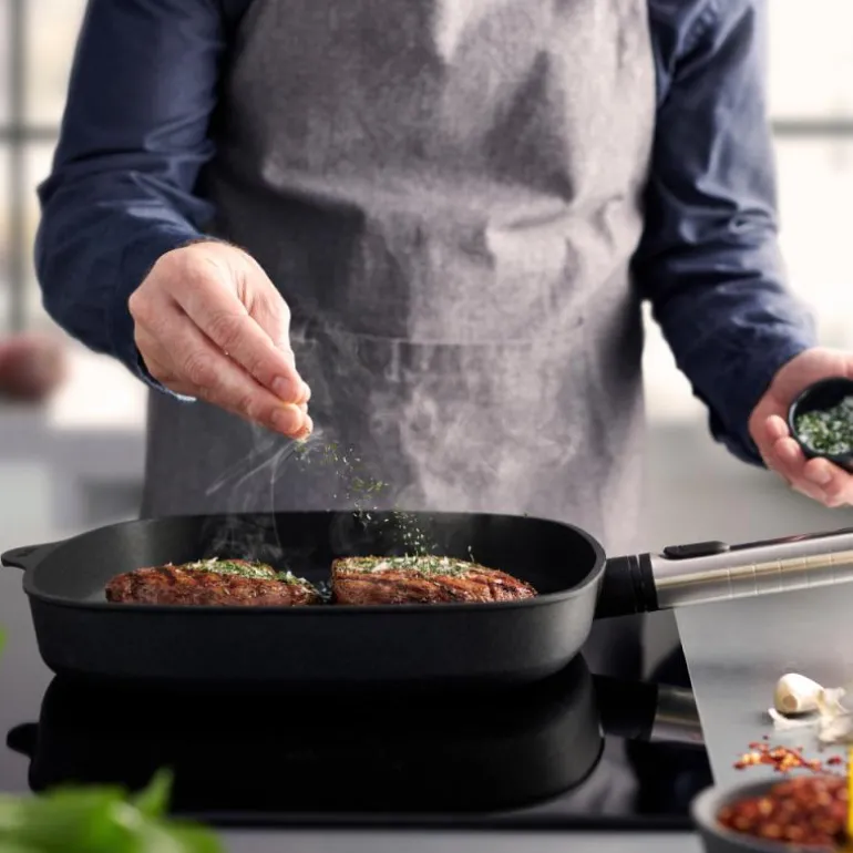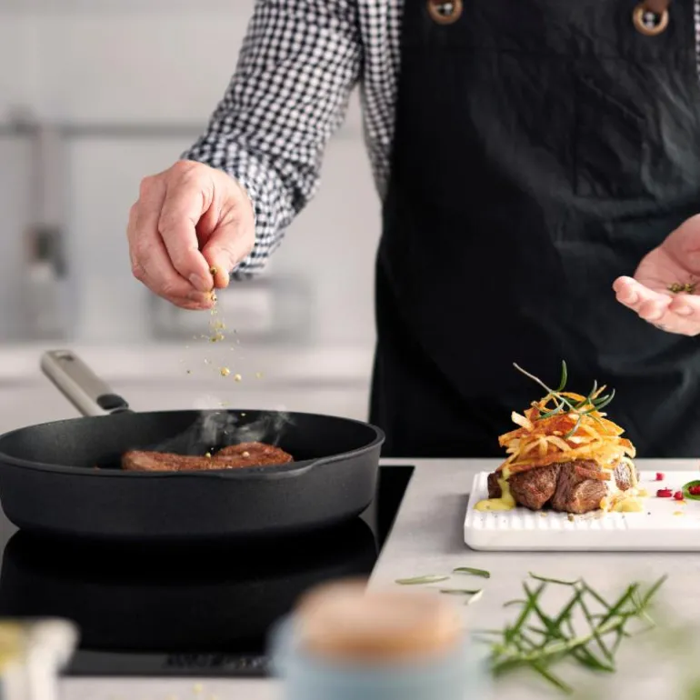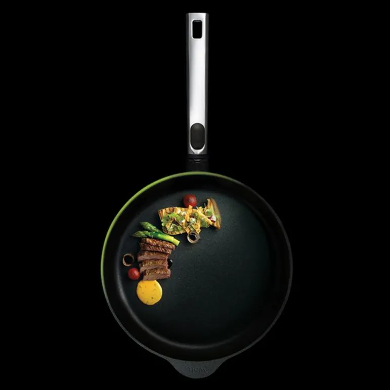 Stekepanne i støpt aluminium, Woll. Utstyrt med et slitesterkt og 5-lags belegg som bla. består av diamant-partikler Avtagbart håndtak. Kan brukes på alle varmekilder, også induksjon. Pannen tåler ovn. Håndtak kan ikke tas i ovn.