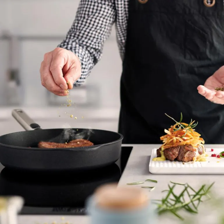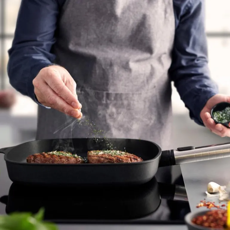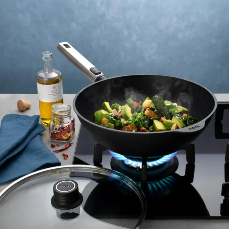 Traktørpanne i støpt aluminium, Woll. Utstyrt med et slitesterkt og PFOA-fritt 5-lags belegg som bla. består av diamant-partikler Avtagbart håndtak i stål. Kan brukes på alle varmekilder, også induksjon. Pannen tåler ovn. Håndtak kan ikke tas i ovn.
