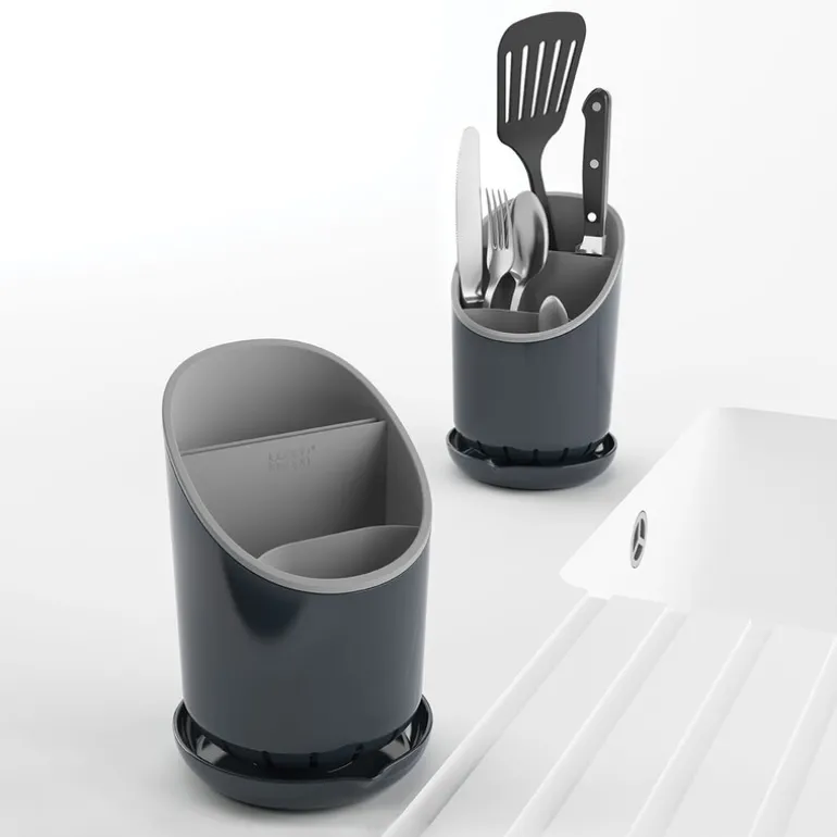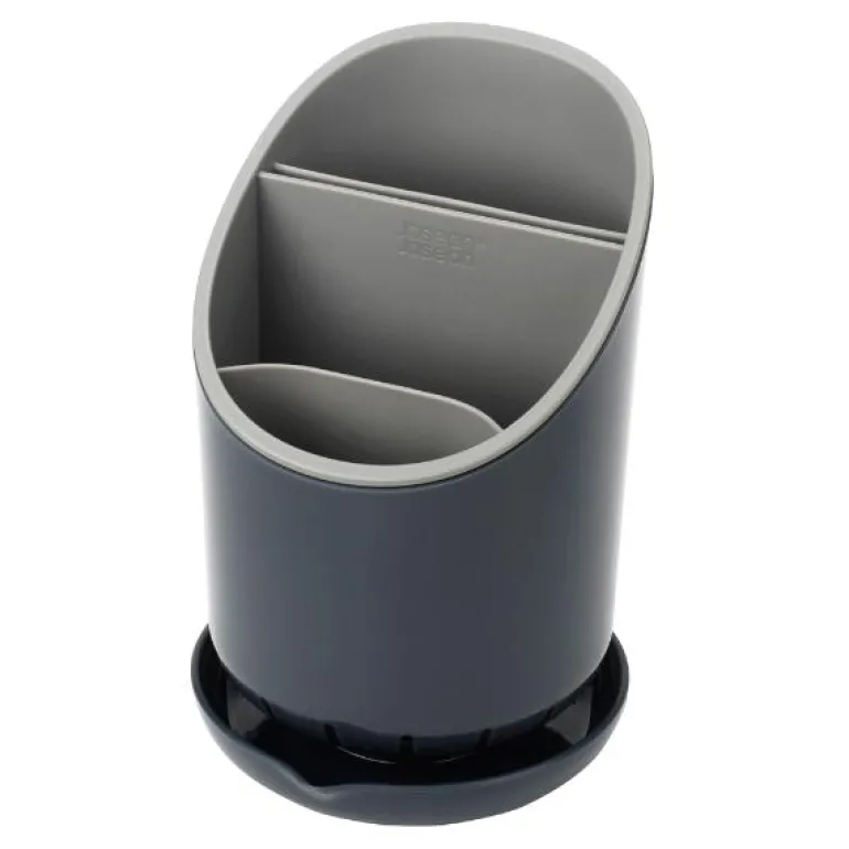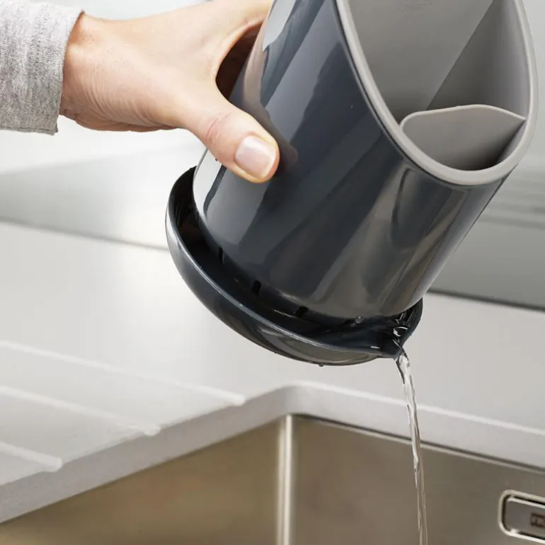 Dock oppvaskstativ fra Joseph Joseph er designet med både sikkerhet og hygiene i tankene. De lagdelte rommene hjelper deg med å enkelt skille forskjellige gjenstander, og det dedikerte knivsporet holder skarpe kniver trygt og sikkert. Overflødig vann samler seg i den drenerende tallerkenen i sokkelen, og denne har også en integrert helletut som gjør det praktisk å tømme. Oppvaskstativet er laget i PP plast og har målene 12 cm i diameter og 19 cm i høyde.