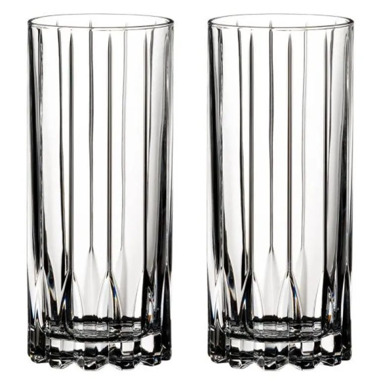To stykk Highball drinkglass fra Riedel Drink Specific. Riedels Highballglass er spesielt fremtatt for Mojito, Tom Collins, Long Island Iced Tea og andre såkalte longdrinks. Denne typen av drinker serveres ofte med masse is, derfor er glassets diameter forholdsvis stor. I mønsteret er det en markering for 6 cl, noe som er til stor hjelp når du blander drinker.