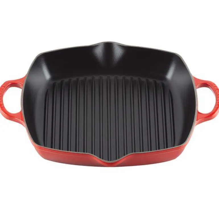 Den dype kvadratiske grillplaten fra Le Creuset egner seg godt for store kjøttstykker, fisk eller grønnsaker til store familier. Grillplaten er laget av støpejern, og kombinerer den innbydende smaken av mat som er grillet på utegrill, med de praktiske fordelene ved innendørs matlaging. Den grillformede bunnen lager de karakteristiske grillstripene på maten, og samler samtidig opp kjøttsaft, marinade, fett og olje. Grillplaten har en innvendig sort emalje som er spesielt fremstilt til matlaging som krever høye overflatetemperaturer. De høye kantene reduserer fettsprut og kan samle opp væske og kraft til bruk i for eksempel sauser. Platen har også en helletut, som er nyttig til å helle av overflødig væske eller olje. Grillplaten tåler alle varmekilder, og kan også brukes på induksjon, i ovn og på grillristen på utegrillen. De to ergonomiske hjelpehåndtakene sørger for enkel og sikker håndtering.