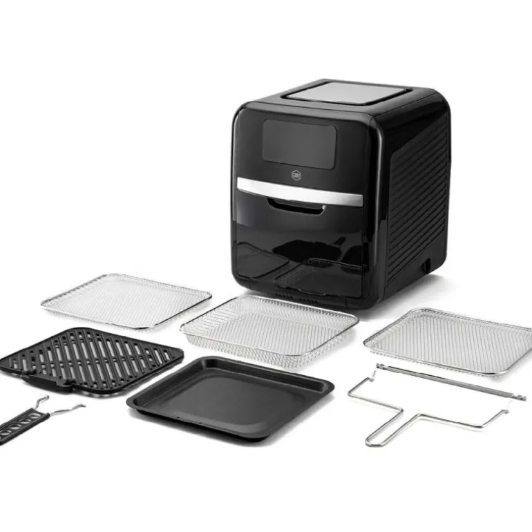 2 tallerkener, pommes fritesskurv, dryppbrett, uttakingsverktøy, grillplate med avtagbart håndtak og roterende grillspyd (rotisserie) for tilberedning av hel kylling samt ribbe. Digital oppskriftsbok for uendelige matlagingsmuligheter er også inkludert.