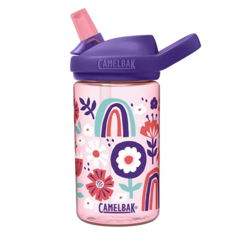 Fin, rosa/lilla drikkeflaske med blomster collage fra Eddy+ Kids serien til Camelbak. Drikkeflasken passer perfekt til aktive barn, og med ventil og lukkemakanisme forhindrer at den lekker selv om den ligger opp ned i en skolesekk, er den ypperlig å ta med på tur.