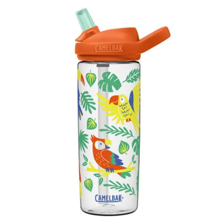 Eddy+ kids drikkeflaske 0,6L tropiske fugler fra Camelbak er ideell for aktive barn. Den har en ventil og lukkemekanisme som forhindrer lekkasje, selv når flasken ligger opp ned i skolesekken. Flasken er lett å drikke av; barnet vipper opp drikketuten, biter og drikker uten å måtte helle på flasken. Den ergonomiske utformingen gjør at flasken ligger godt i hånden, og det integrerte håndtaket gjør det enkelt å feste den til en karabinkrok eller bære den med én finger. Den store åpningen gjør det enkelt å fylle flasken, og den tåler oppvaskmaskin for enkel rengjøring. Flasken påvirker verken smak eller lukt av innholdet, slik at barnet alltid kan nyte frisk drikke.