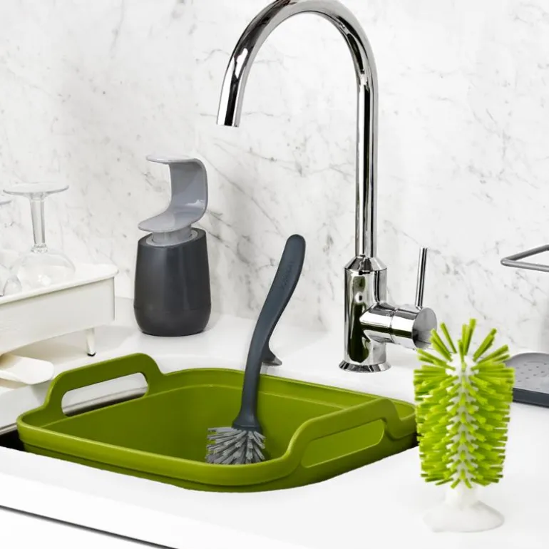 Edge oppvaskbørste er en praktisk oppvaskbørste i grå plast, som er svært enkel å holde hygienisk ren. Denne oppvaskbørsten er designet for å hvile sikkert på siden av vasken din, slik at alt såpevannene bare renner bort. Børstehodet er utformet for å komme til i alle hjørner og har en hardere del som hjelper med å skrape bort stivnede matrester. Oppvaskbørsten tåler oppvaskmaskin, og den er laget i plast.