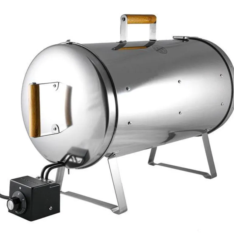 El-røykeovn av rustfritt stål, fra Muurikka, med tre-trinns temperaturregulering og innebygd termometer.
