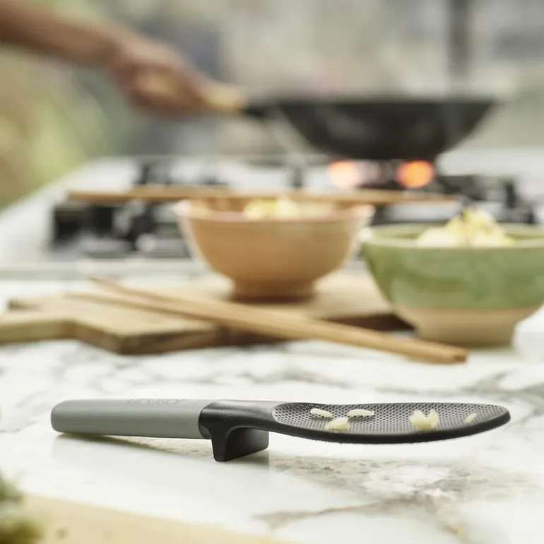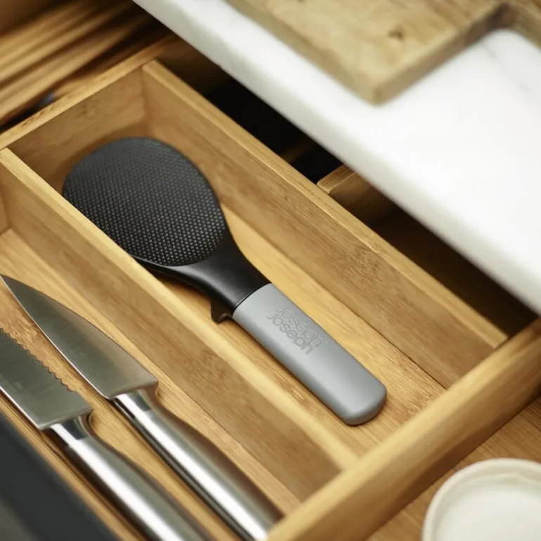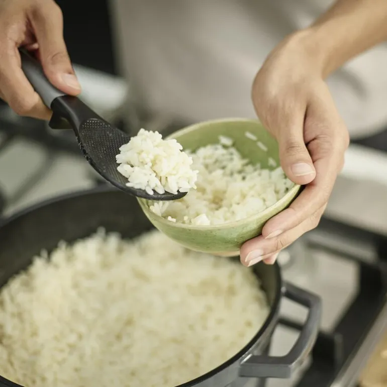 Elevate Fusion risøse 19,8 cm i grå fra Joseph Joseph er det ideelle verktøyet for å servere perfekt kokt ris uten å skade de delikate kornene. Uansett om du bruker en riskoker eller favorittgryten din, gjør det brede, flate hodet det enkelt å øse og servere ris uten at kornene fester seg til redskapet, takket være den strukturerte overflaten. Håndtaket har en integrert verktøystøtte som sørger for at øsen aldri berører benkeplaten, noe som bidrar til forbedret hygiene og reduserer søl på kjøkkenet. Denne risøsen er varmebestandig opp til 200°C og kan trygt brukes med non-stick kokekar uten å skade belegget.