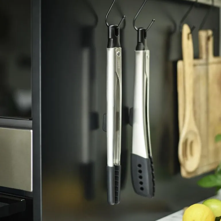 Elevate Fusion tang 5,8 cm i stål fra Joseph Joseph er et praktisk sett med to tenger som er perfekt for ulike matlagingsoppgaver. Settet inkluderer en presisjonstang som er ideell for håndtering av delikat mat som sjømat og grønnsaker, samt en større tang som er utmerket for å gripe tykkere matvarer som kjøttstykker. Begge tangene er utstyrt med Joseph Josephs Elevate-teknologi som reduserer søl og forbedrer hygienen ved å hindre at tangspissene berører arbeidsflaten, takket være de integrerte verktøystøttene.
