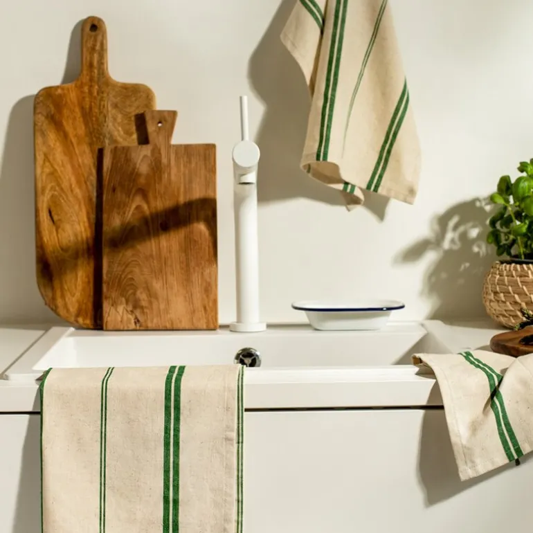 Dekorativ duk 145×250 cm i stripe natur/grønn fra Elsa-serien til Stiernholm er et ideelt valg for å skape en raffinert og innbydende borddekking. Denne duken, laget av en førsteklasses blanding av 70 % myk bomull og 30 % slitesterkt lin, kombinerer luksuriøs komfort med holdbarhet, noe som gjør den perfekt til både daglig bruk og festlige anledninger.