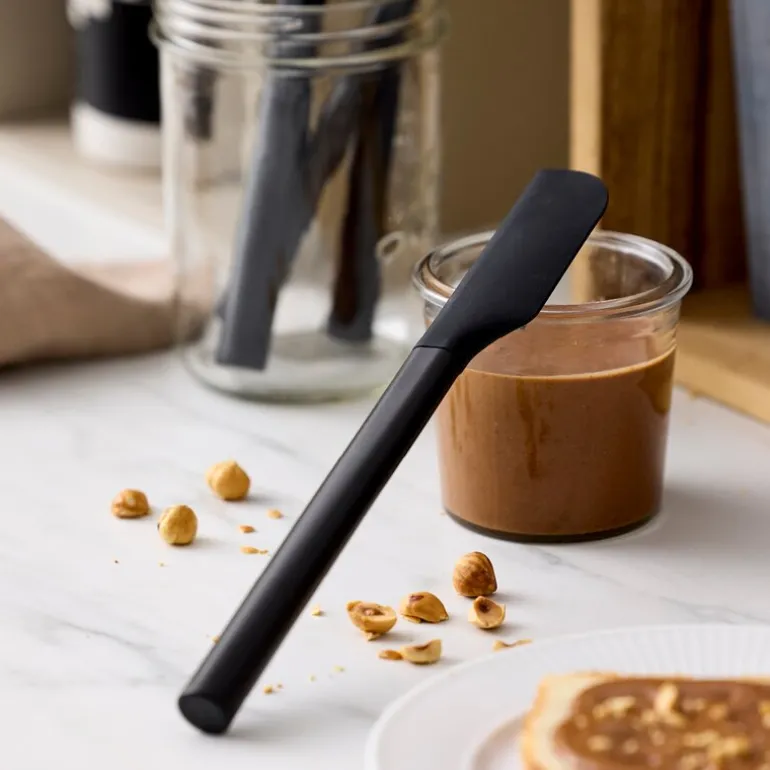 Emma slikkepott smal, svart fra Rosti måler 25,2 x 3,3 cm og er ideell for bruk i glass, bokser og beholdere med trange åpninger. Den slanke formen gjør det enkelt å skrape ut innhold uten søl, og den egner seg godt til syltetøy, sauser og lignende.