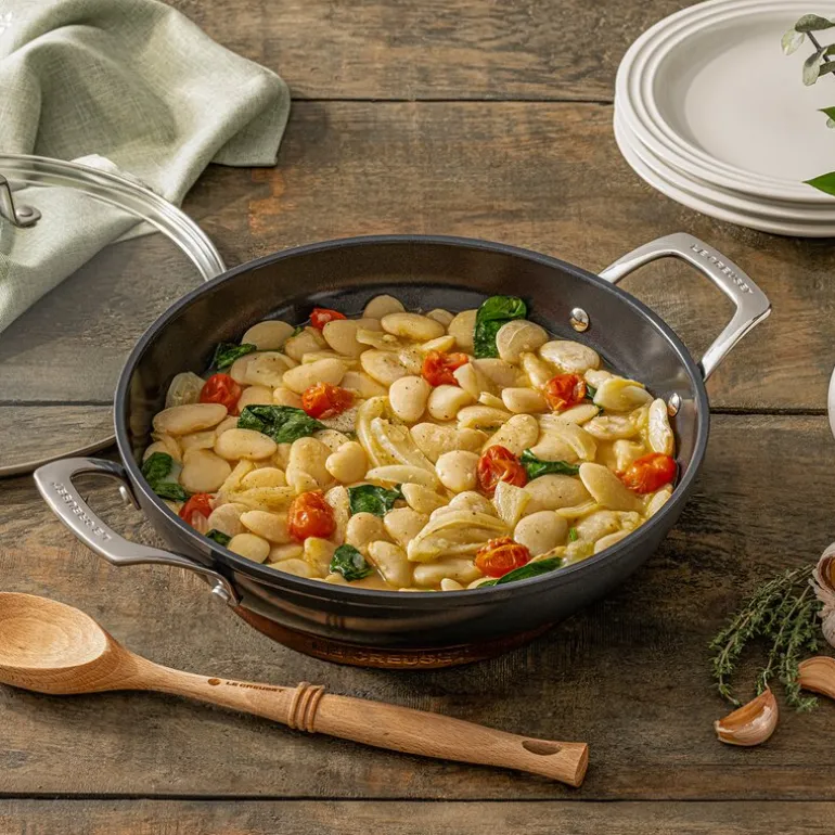 - Fjern all emballasje og vask pannen i varmt såpevann, skyll og tørk grundig. Beting non-stick kokeflaten ved å gni et lag vegetabilsk olje innvendig, skyll med varmt vann og tørk. Bruk middels eller lav varme for best matlagingsresultater, og velg silikon- eller treverktøy. Unngå å dra pannen over glassoverflater, løft den i stedet. Produktet tåler ovn opp til 280°C, og glasslokk opp til 220°C. Bruk grytekluter, la pannen avkjøles før rengjøring, og vask med ikke-slipende redskaper. Den er fryserkompatibel og oppvaskmaskinsikker, men håndvask anbefales for lengre levetid.