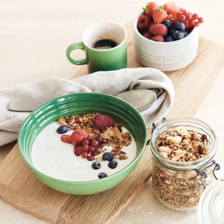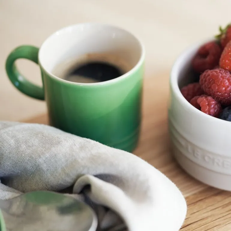 Tilgjengelig i et bredt spekter av livlige farger, bringer disse koppene en ekstra fargeklatt til kjøkkenet ditt. Med sitt elegante treringsdesign, inspirert av Le Creusets ikoniske støpejernsgryter, passer de sømløst inn i enhver Le Creuset-samling.