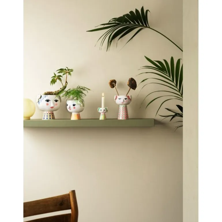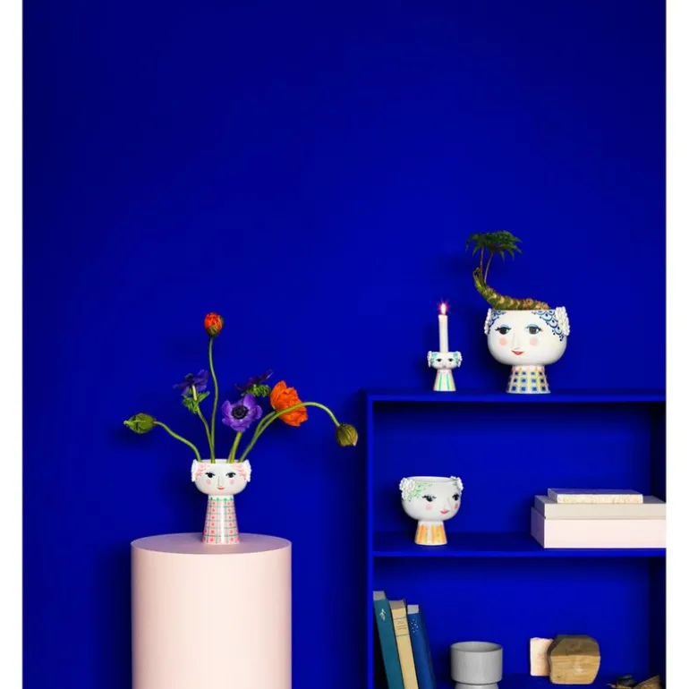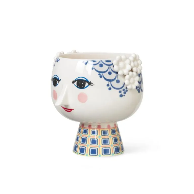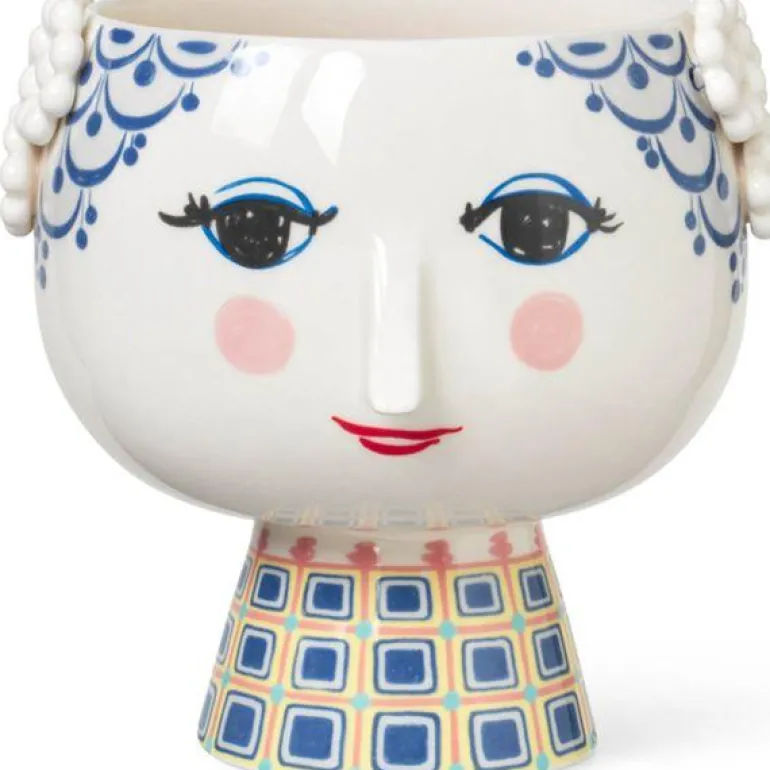 En glad og smilende EVA urtepotteskjuler fra Bjørn Wiinblad i blå nyanser. Urtepotten har en diameter på 21 cm, er 19 cm høy og kan brukes til mellomstore blomster eller kreative blomster dekorasjoner. Eva urtepotte er laget av blankglassert keramikk med farverikt dekor og er inspirert av Wiinblads originale EVA vaser, som hadde brede hoder med blomsterdekorasjoner og en kjegleformet kropp. Det delikate ansiktet er fra Wiinblads opprinnelige strek, og kjolemønsteret er en fortolkning av Bjørn Wiinblads illustrasjoner .